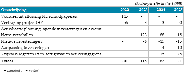 - De planning van de lopende investeringen is in 2022 beoordeeld en waar nodig aangepast. Deze aanpassing heeft effect op de kapitaallasten in de jaren 2023 en verder;